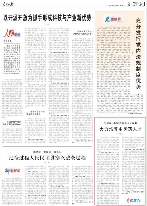 8月31日,《人民日报》9版(理论版)刊发我校世足赔率 肖圣鹏副教授理论文章《为健康中国建设提供人才保障大力培养中医药人才》。文中指出,贯彻落实习近平总书记关于中医药人才培养的重要指示,要探索建立符合中医药特点的人才培养模式,为健康中国建设提供人才保障。一要提升中医药教育整体水平。帮助学生树立全面系统的中医药学思维方式,培养德才兼备、内外兼修的中医药特色人才。二要坚持发展中医药师承教育。亟须将传统教育的精髓融入现代教育体系,把师承教育贯穿于临床实践教学全过程。三要完善中医药人才评价和激励机制。按照“干什么评什么”原则,结合实际采取不同的评价方式。