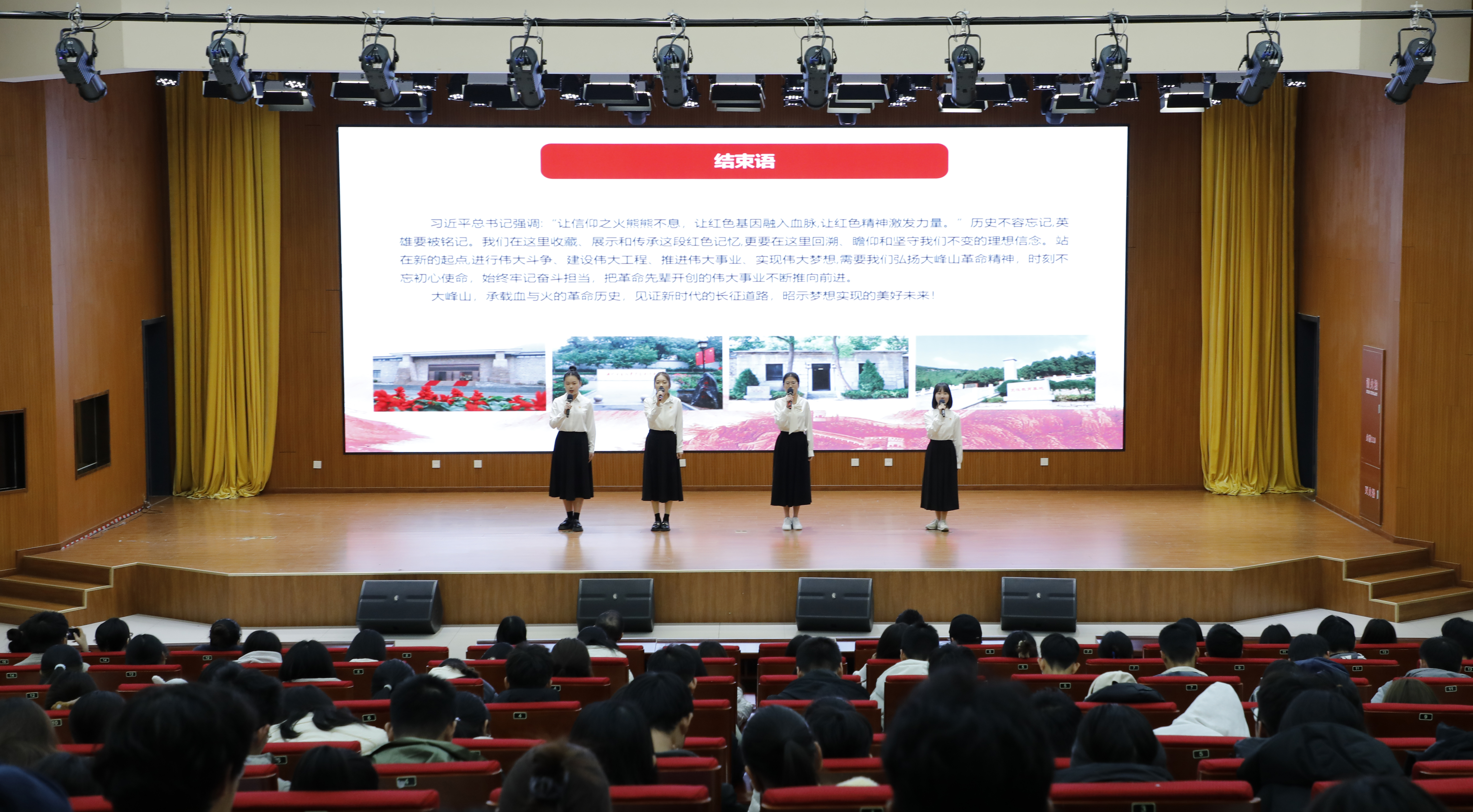 青年教师赵子涵以“感悟革命精神,传承红色血脉”为题,结合大峰山革命故事,提炼总结了斗争精神、理想信念、人民至上等精神特质,勉励同学们将大峰山革命精神融入到日常的学习和生活中,努力成为担当民族复兴大任的时代新人。同学们纷纷表示,历史是最好的教科书,将以革命先辈为榜样,坚定目标、脚踏实地、不懈奋斗,为书写挺膺担当中国式现代化建设新篇章贡献青春力量。