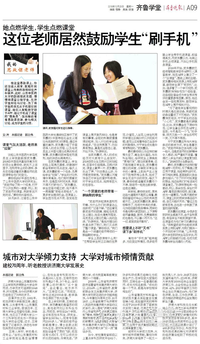 “武老师讲起课来温和而平静,为什么你们的课堂这么活跃呢?”记者不解。“您注意观察武老师的眼睛,提起马克思主义理论,她目光清亮而笃定,马克思主义理论已融入她的血液。”孙源梓说,“是她对理论的热爱点燃了我们,我们又点燃了整个课堂。”秦杨杨说,“我们是由一个深邃的老师带领的一群幽默的学生。”