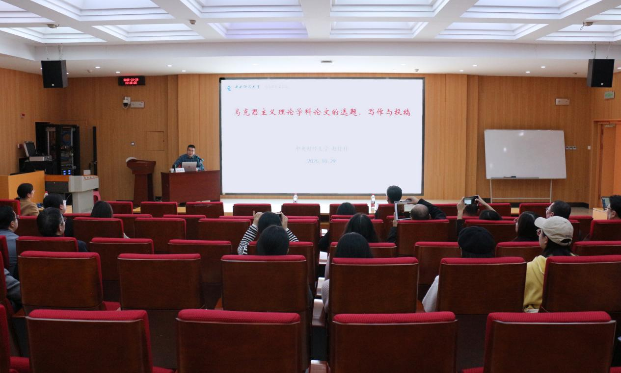 赵付科教授结合自身丰富的科研经验和深厚的学术造诣,围绕马克思主义理论学科论文的选题策略、写作规范与投稿技巧进行了系统讲解。他从当前学术前沿出发,聚焦学科发展的现实需求,深入剖析了高质量论文的生成逻辑与发表路径。赵教授通过典型案例解析与实操建议,帮助师生进一步把握科研方向、提升写作能力、增强投稿信心。现场师生纷纷表示,赵付科教授的讲解既有理论高度,又具实践指导意义,对今后开展学术研究和论文写作具有重要的启发作用。